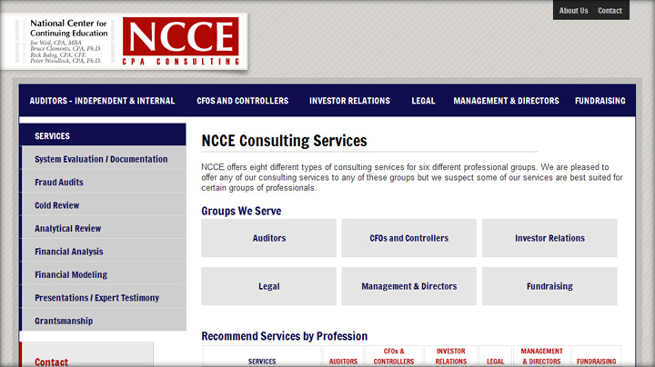 The NCCE Consulting Website (www.ncceconsulting.com) was created for the National Center for Continuing Education (NCCE) in Tallahassee, FL. The Consulting Division of NCCE offers expert financial consulting services in support of NCCE’s training seminars. The website contains descriptions of services and online contact form submission.
